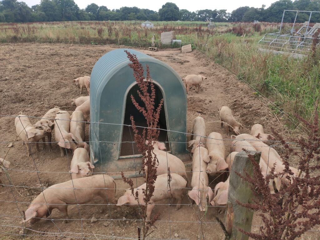 Le porc blanc de l’ouest est une race pour le plein air. Nos porcs bénéficient de parcs mobiles dans un champ clôturé de 6 ha.